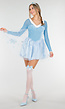Magisch blauw IJsprinses kostuum. De jurk heeft een glanzende satijnen rok met glitterende sneeuwvlokken en een zachte witte kraag van imitatiebont. De top bevat padded cups, zodat je geen bh hoeft te dragen, en is gemaakt van stretchstof voor een comfortabele, aansluitende pasvorm. Aan de zijkant zit een blinde rits, waardoor de jurk gemakkelijk aan en uit te trekken is. De doorschijnende mouwen en de cape met sneeuwvlokprint geven het geheel een sprookjesachtige uitstraling. De set wordt compleet geleverd met een bijpassend kroontje voor de ultieme prinsessenlook. Perfect voor themafeesten, carnaval of een animatie-party.