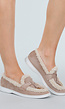 Deze zwarte instappers zijn gemaakt van een suède-look materiaal en afgewerkt met een zachte teddy rand in een contrasterende beige tint. Aan de voorkant is de schoen versierd met een decoratief bandje en goudkleurig detail. De platte zool is licht en comfortabel, waardoor deze instappers perfect zijn voor dagelijks gebruik tijdens de koudere maanden.