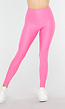 Deze felroze legging heeft een aansluitende pasvorm met een hoge tailleband die zorgt voor een stevige en comfortabele fit. De stof heeft een lichte glans en een rekbare structuur, waardoor deze goed aansluit op het lichaam. De tailleband is breed en biedt extra ondersteuning. De legging heeft aan de voorzijde een naad die vanaf de tailleband naar het kruis loopt, waardoor een V-vormig paneel ontstaat dat zorgt voor een flatterende pasvorm. Aan de achterzijde loopt een ronde naad net onder de tailleband, die de ronding van de billen volgt en extra vorm geeft.