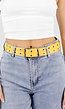 Gele riem met metalen gesp en meerdere oogjes over de gehele lengte. Voorzien van een verstelbare sluiting en stevige band. Geschikt om te dragen door riemlussen van broeken of rokken. De riemmaat is 95. De volledige lengte van de riem bedraagt 102 cm.