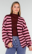 Dit wollen vest in roze en bordeaux heeft een grofgebreide structuur en duidelijke brede strepen. Het model valt los en comfortabel, met lange mouwen en een open voorkant. De zachte, wollige look maakt het ideaal als cozy laag voor casual en dagelijkse outfits.