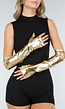 Deze goudkleurige lange handschoenen hebben een opvallende metallic glans en zijn gemaakt van soepel stretchmateriaal. De open vingertoppen maken ze praktisch en geven een stoer accent aan het ontwerp. Ideaal om te combineren met een feestelijke of futuristische outfit.