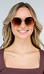 Deze zonnebril is uitgevoerd met een rond metalen montuur in goudkleur en is voorzien van glazen met een bruin kleurverloop. Het model heeft een slanke neusbrug met verstelbare neuspads. De pootjes zijn uitgevoerd in goudkleurig metaal en afgewerkt met decoratieve ringdetails aan de zijkant. De uiteinden van de pootjes zijn voorzien van een zwarte kunststof afwerking.