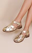 Goudkleurige sandalen met een open neus en gekruiste banden over de voet. Voorzien van een verstelbare gesp aan de zijkant en een platte zool. Gemaakt van een metallic materiaal met een stevige pasvorm.