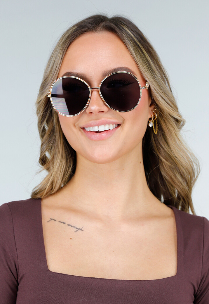Deze zonnebril is uitgevoerd met een rond metalen montuur in goudkleur en heeft egaal donker getinte glazen. Het model is voorzien van een slanke neusbrug en verstelbare neuspads. De pootjes zijn uitgevoerd in goudkleurig metaal en afgewerkt met decoratieve ringdetails aan de zijkant. De uiteinden van de pootjes zijn voorzien van zwarte kunststof afwerking voor extra draagcomfort.