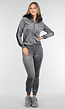 Deze grijze set bestaat uit een tweedelig huispak van zachte velours stof. Het bovenstuk is een vest met ritssluiting, buidelzak en een capuchon afgewerkt met grijs nepbont. De broek heeft een elastische tailleband, aansluitende pasvorm en geribde boorden aan de enkels. Langs de mouwen en broekspijpen loopt een bies met ingeweven tekstdetails. De stof heeft een fluweelachtige structuur en lichte glans.