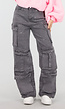 Deze cargo broek is uitgevoerd in een grijze denim stof met kleine strass steentjes verspreid over het gehele oppervlak. Het model heeft een hoge taille met riemlussen en een knoop- en ritssluiting aan de voorzijde. De broek is voorzien van steekzakken, achterzakken en meerdere opgestikte cargozakken op de boven- en onderbenen. De pijpen vallen recht en wijd tot over de enkel. De broek bevat lichte stretch.