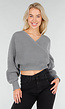 Deze grijze gebreide overslagtrui heeft een elegante V-hals voor een flatterende pasvorm. De zachte stof en het overslagontwerp zorgen voor een stijlvolle en comfortabele uitstraling. Perfect te combineren met een hoge jeans of rok voor een casual look.