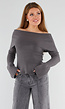 Deze grijze trui is gebreid in een fijn ribpatroon en heeft een off shoulder halslijn die recht over de schouders loopt. Het model is licht getailleerd en loopt onderaan uit in een subtiele peplumvorm. De lange mouwen hebben een wijde uitlopende zoom die tot over de pols valt. De stof is elastisch en sluit comfortabel aan. De halslijn is voorzien van een brede, omgeslagen boord.