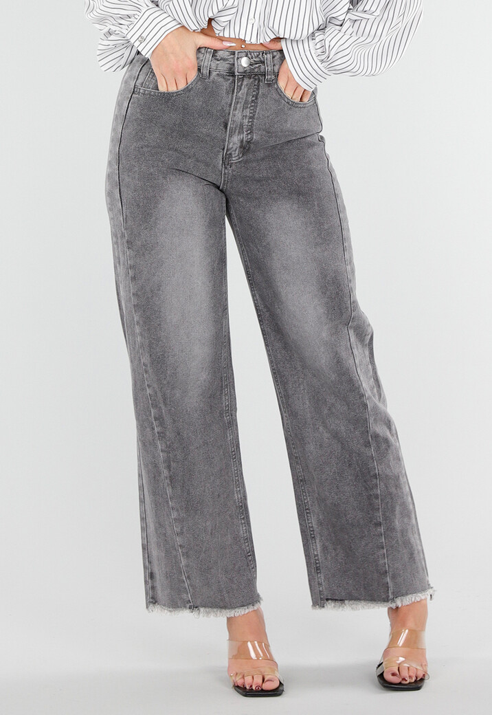 Grijze jeans van katoen met een high waist en straight leg pasvorm. De broek sluit met een knoop en rits en heeft steekzakken aan de voor- en achterkant. De onderkant heeft een rafelige zoom.