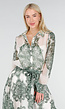 Deze blouse is uitgevoerd in een witte, semi-transparante stof met een groene paisley print. Het model heeft lange mouwen met manchetten en een klassieke kraag. Aan de voorzijde loopt een knoopsluiting over de gehele lengte. De blouse wordt geleverd met een bijpassend hemdje.