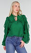 Deze blouse is uitgevoerd in een groene, licht transparante chiffonstof. Het model heeft lange mouwen met elastische manchetten en is afgewerkt met verticale ruches langs de voorzijde en op de mouwen. De hals is voorzien van een kleine split met een strikkoordsluiting. De blouse heeft een rechte pasvorm en valt los om het lichaam. De stof is soepel en licht van structuur.
