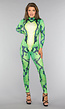 Deze groene slangen jumpsuit is gemaakt van een elastische stof en heeft daarom veel stretch. De jumpsuit heeft een hoge kraag met een ritssluiting aan de achterzijde en lange mouwen. Deze jumpsuit is perfect voor Halloween!