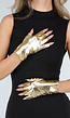 Deze goudkleurige handschoenen zijn gemaakt van soepel stretchmateriaal met een metallic glans. Ze hebben een kort model met halve vingers, waardoor je vingertoppen vrij blijven. De stof sluit strak aan en rekt licht mee, wat zorgt voor een comfortabele pasvorm. Ideaal voor feestjes, dansavonden of thema-outfits.