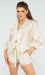 Deze prachtige set in cremekleur is een must-have voor jouw garderobe. De top heeft een unieke ruffle-structuur die een prachtig effect toevoegt aan de outfit. Gemaakt van een lichte, glimmende stof. De bijpassende shorts zijn uitgevoerd met een elastische tailleband voor extra comfort en zijn perfect voor warme dagen. Dit setje is ideaal voor de zomer.