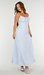 Deze lichtblauwe maxi-jurk is gemaakt van een gladde, licht glanzende stof met een soepelvallende pasvorm. De jurk heeft smalle verstelbare spaghetti bandjes en een licht gerimpelde buste met striksluiting aan de voorkant. Aan de achterzijde bevindt zich een vetersluiting met elastische inzet voor extra comfort. De jurk loopt recht naar beneden en reikt tot op de enkels.