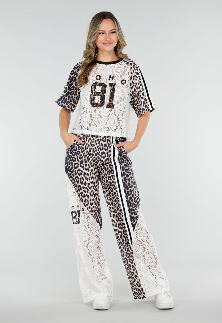 Deze set bestaat uit een top en een bijpassende lange broek met een combinatie van kant en panterprint. De top is uitgevoerd in transparante witte kant met korte mouwen, een ronde hals en contrasterende boorden. Op de voorzijde is een grafische tekstprint zichtbaar. De broek heeft rechte, lange pijpen en is deels uitgevoerd in transparante kant en deels in panterprint stof. Langs de zijkanten lopen contrasterende verticale strepen. De broek is voorzien van een elastische tailleband met trekkoord en steekzakken.