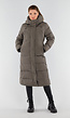 Deze khaki lange gewatteerde winterjas heeft een rechte pasvorm met horizontale stiknaden. De jas is voorzien van een capuchon met verstelbaar trekkoord, een ritssluiting met windflap en drukknopen, en twee zijzakken. De mouwen zijn afgewerkt met ingewerkte manchetten met duimgaten voor extra bedekking. De binnenkant is volledig gevoerd en doorgestikt voor extra isolatie.