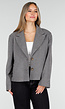 Deze korte jas is uitgevoerd in een grijze wollook stof met een subtiel visgraatmotief. Het model heeft een klassieke reverskraag en een dubbele knoopsluiting aan de voorkant. De ceintuur in dezelfde stof kan gestrikt worden om de taille te accentueren. De mouwen zijn voorzien van knoopdetails op de manchetten.