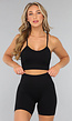 Deze sportset is gemaakt van een dikke stretchstof en biedt ook compressie op de plekken waar nodig. De stof is heerlijk zacht en enorm ademend. De set heeft een zwarte kleur. De sport BH heeft een rondlopende hals met spaghettibandjes en uitneembare pads. De short van de set heeft een high waist model en een scrunch op de achterkant.