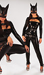 Dit kostuum bestaat uit meerdere losse onderdelen en is uitgevoerd in een zwarte stof met een lederlook afwerking en stretch. Het kostuum omvat een korset top, een broek, losse mouwen, een masker en een bijpassende riem. De broek heeft een low waist pasvorm, lange pijpen en is voorzien van een ritsluiting aan de zijkant. De stof van de broek is elastisch. De korset top sluit met een rits aan de zijkant en heeft een vetersluiting aan de achterzijde. De losse mouwen zijn uitgevoerd in dezelfde stof als de broek, bevatten stretch en sluiten zowel aan de voor- als achterzijde met een vetersluiting. Het masker en de riem maken het kostuum compleet. Het geheel heeft een aansluitende pasvorm.