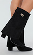 Deze zwarte enkellaarzen hebben een puntige neus en een middelhoge schacht met een brede omslag. Aan de zijkant bevindt zich een goudkleurig metalen detail. De laarzen zijn uitgevoerd in een suède-achtig materiaal met een stevige hak en een smalle pasvorm rond de voet. De zool is licht profiel en de schacht valt soepel naar beneden voor een volumineus effect.