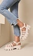 Lichtbeige sandalen met meerdere banden over de voet. Voorzien van een verstelbare gesp aan de zijkant en een open neus. Gemaakt van suède materiaal met een dikke zool en grof profiel.
