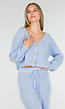 Deze lichtblauwe two piece set bestaat uit een gebreid vest en een bijpassende broek. Het vest heeft een V-hals, lange mouwen en sluit met drie knopen aan de voorzijde. De broek is voorzien van een trekkoord in de taille en heeft een rechte pijp die soepel langs het been valt. Beide items zijn uitgevoerd in een grofgebreide stof die comfortabel draagt.