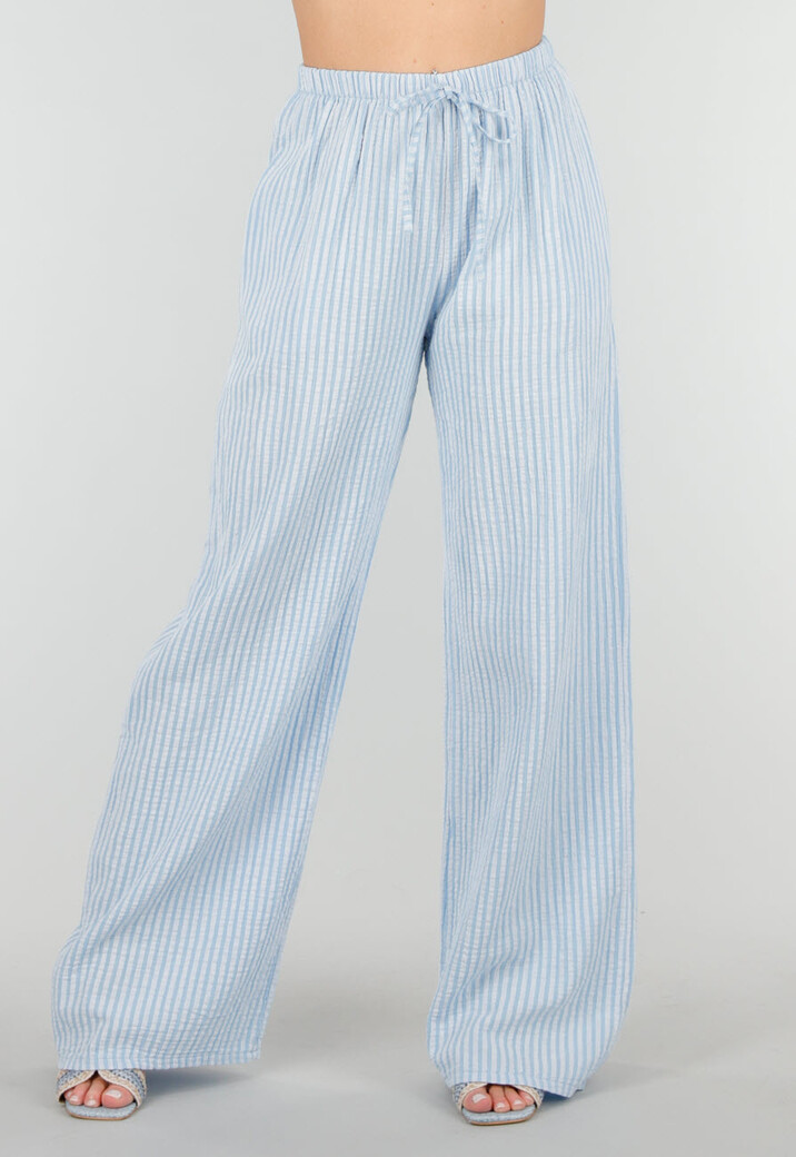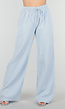 Deze broek is gemaakt van een luchtige linnenlook stof met lichte stretch. De tailleband is volledig elastisch en afgewerkt met een sierstrik aan de voorkant. De broek heeft een high waist fit, een straight fit en is hij voorzien van verticale strepen. Ook heeft hij twee steekzakken aan de voorkant. Perfect voor een dagje strand of een avondje uit.