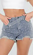 Lichtblauwe denim short met strass steentjes aan de voorzijde. Voorzien van een knoop- en ritssluiting en een extra decoratieve band met knoop. Het model heeft steekzakken, achterzakken en een rafelzoom aan de onderzijde.