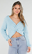 Deze blauwe gebreide trui is gemaakt van een zachte wolmix met een fluffy uitstraling en comfortabele stretch. Het model heeft een diepe V-hals en een speelse twist aan de voorzijde. De lange mouwen en de losvallende pasvorm zorgen voor een comfortabele fit. De trui kan ook achterstevoren gedragen worden, waardoor er een stijlvolle open rug ontstaat.