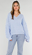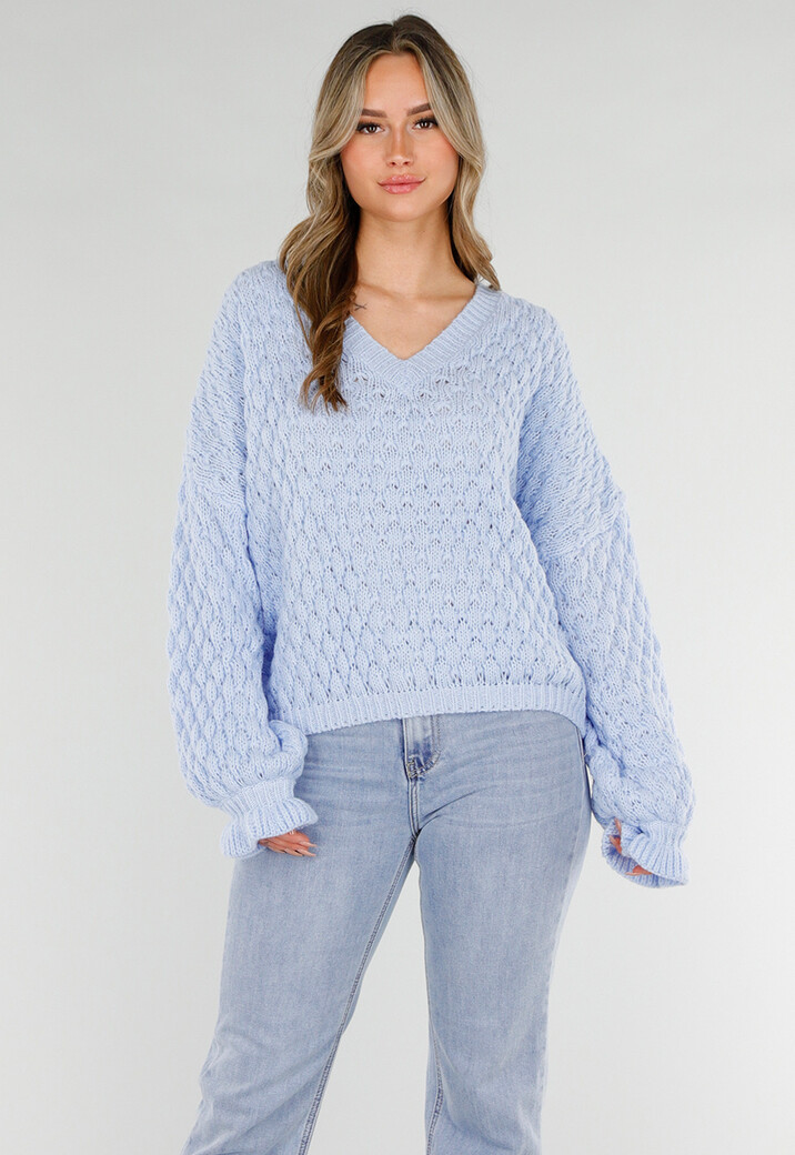 Deze lichtblauwe trui is uitgevoerd in een grofgebreide structuur met opengewerkt patroon. Het model heeft een V-hals met geribde boord en lange mouwen. De mouwen zijn ruim gesneden en afgewerkt met geribde manchetten. De onderzijde is voorzien van een geribde zoom. De pasvorm valt los om het lichaam en de lengte reikt tot op de heup.