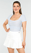 Deze lichtblauwe top is gemaakt van een zachte en rekbare stof, wat zorgt voor een uitstekende pasvorm. De top heeft een unieke structuur met subtiele stiksels over de borst en een speelse kanten afwerking aan de onderkant. De ronde halslijn en korte mouwen geven de top een frisse uitstraling. De achterzijde is voorzien van een grote strik om de top perfect af te kunnen stellen.