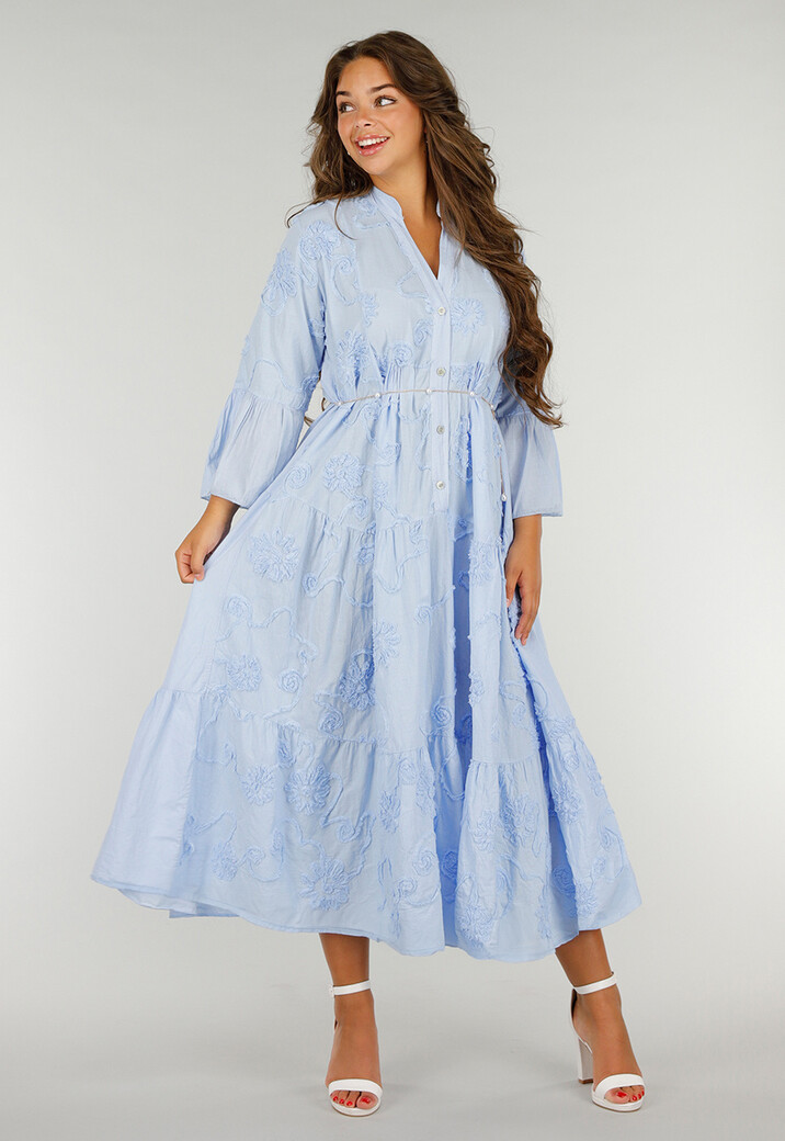 Deze lichtblauwe maxi-jurk is gemaakt van 100% katoen en heeft een luchtige uitstraling dankzij de linnenlook textuur. De jurk sluit aan de voorzijde met knopen en heeft een subtiele opstaande halslijn met V-inkeping. De 3/4 trompetmouwen lopen uit aan de onderzijde en zijn afgewerkt met een brede rand. Over de gehele jurk zijn ton-sur-ton bloemvormige borduursels verwerkt. De rok bestaat uit meerdere gerimpelde lagen die zorgen voor extra volume.