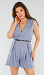 Deze lichtblauwe playsuit is gemaakt van een soepel vallende stof zonder stretch en heeft een subtiele textuur. Het model heeft een overslag V-hals en korte, losvallende mouwen. In de taille bevindt zich een brede strikceintuur in dezelfde stof, waarmee de pasvorm licht getailleerd kan worden. De shortspijpen zijn wijd uitgesneden en vallen losjes rond het bovenbeen.