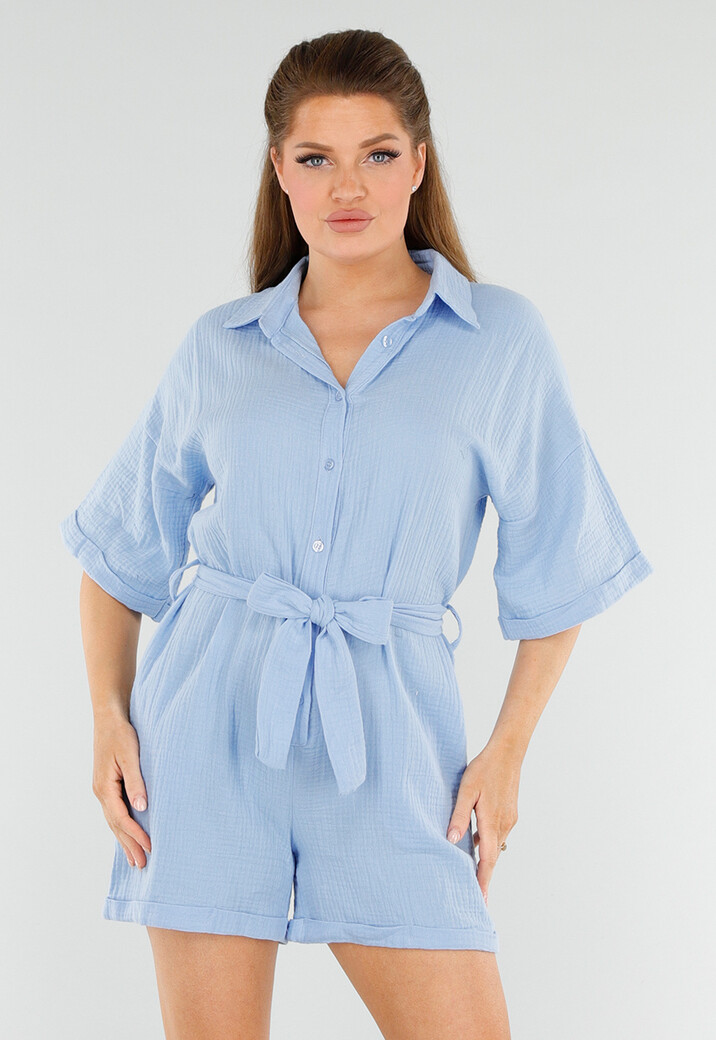Deze lichtblauwe playsuit is gemaakt van 100% katoen met een luchtige, licht gekreukte mousseline structuur. Het model heeft een klassieke overhemdkraag en een doorknoopsluiting aan de voorzijde. In de taille zit een stoffen ceintuur om de pasvorm aan te passen. De shortspijpen vallen los en zijn afgewerkt met een vaste zoom. Aan beide zijkanten bevinden zich schuine steekzakken. De korte mouwen zijn ruim uitgesneden met vaste omslag. De stof is niet elastisch, maar voelt licht en ademend aan.
