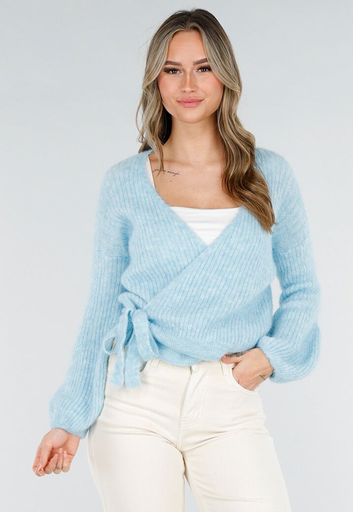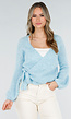 Dit vest is uitgevoerd in een lichtblauwe fijngebreide ribstof en bestaat uit een comfortabele wolmix.. Het model heeft een overslag aan de voorzijde die wordt vastgezet met een striksluiting aan de zijkant. De trui heeft een V-hals en lange mouwen met een licht volumineuze vorm. De manchetten en onderzijde zijn afgewerkt met een ribboord en de pasvorm sluit aan op het lichaam.