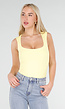 Deze body is uitgevoerd in een gele kleur en heeft een aansluitende pasvorm. Het model is mouwloos en voorzien van een vierkante halslijn aan de voorzijde. De top is gevoerd zodat deze niet doorschijnt en zorgt voor extra comfort. De body is hoog uitgesneden bij de heupen. De onderzijde sluit met een haaksluiting. De stof is glad en elastisch.