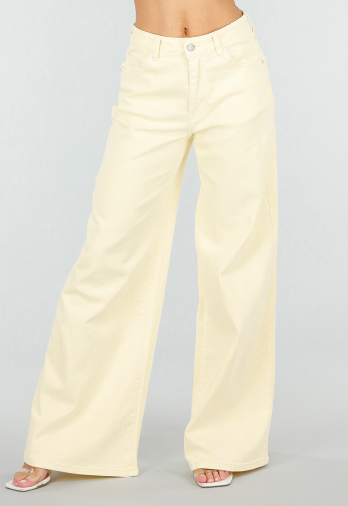 Deze lichtgele jeans is uitgevoerd in een stevige denim stof met lichte stretch en heeft een wide leg model. Het model heeft een high waist pasvorm en sluit met een knoop- en ritssluiting aan de voorzijde. De jeans is voorzien van steekzakken aan de voorkant en opgestikte zakken aan de achterzijde. De rechte wijde pijpen geven het model een duidelijke wide leg pasvorm. De tailleband is afgewerkt met riemlussen en de pijpen vallen lang en recht naar beneden.