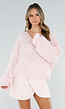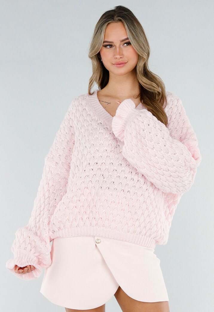 Deze lichtroze trui is uitgevoerd in een grofgebreide structuur met opengewerkt patroon. Het model heeft een V-hals met geribde boord en lange mouwen. De mouwen zijn ruim gesneden en afgewerkt met geribde manchetten. De onderzijde is voorzien van een geribde zoom. De pasvorm valt los om het lichaam en de lengte reikt tot op de heup.