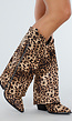 Deze cowboylaarzen zijn uitgevoerd in een stevige suèdelook met all-over luipaardprint in beige, bruin en zwart. De schacht is hoog en loopt uit in een V-vormige uitsnijding aan de bovenzijde, afgewerkt met lussen aan weerszijden. Langs de buitenzijde bevindt zich een ritssluiting. De laars heeft een spitse neus en een stevige zwarte blokhak. Het model valt tot net onder de knie.