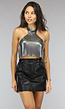 Metallic Zilveren Halter Coin Top met Open Rug Lees meer.