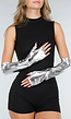 Deze zilverkleurige lange handschoenen hebben een opvallende metallic glans en zijn gemaakt van soepel stretchmateriaal. De open vingertoppen maken ze praktisch en geven een stoer accent aan het ontwerp. Ideaal om te combineren met een feestelijke of futuristische outfit.