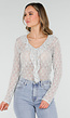 Deze top is uitgevoerd in een fijn kanten materiaal met een open, verticale structuur. Het model heeft een aansluitende pasvorm, lange mouwen en een V-halslijn. Langs de hals en het middenvoorpand is een vast aangezette rucherand verwerkt. De stof is doorschijnend en heeft geen sluiting.