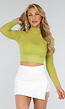 Deze top is gemaakt van een strechy mesh stof waardoor hij een mooie doorschijnende look heeft. Binnenin de top is een sport-bh ingewerkt zodat je zelf niks eronder hoeft te dragen. Deze sport-bh heeft ingewerkte pads waardoor het dragen van een bh overbodig is. De top heeft lange mouwen en een hoge kraag en aan de onderzijde is hij voorzien van een brede elastische band.