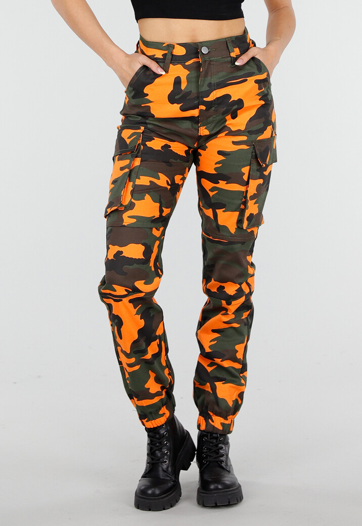 Oranje camouflage cargo broek met rechte pasvorm. Voorzien van steekzakken, achterzakken en klepzakken op de benen. De broek heeft een knoop- en ritssluiting en elastische boorden aan de onderkant van de pijpen.