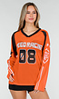 Deze top is uitgevoerd in oranje mesh materiaal met een licht doorschijnende structuur. Het model heeft een V-hals met zwarte boord, lange mouwen en een rechte, losvallende pasvorm. Op de voorzijde is een contrasterende tekst en een groot numeriek motief aangebracht. De schouders en mouwen zijn deels uitgevoerd in zwart mesh met witte streepdetails. De onderzijde is recht afgewerkt.