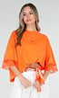 Oranje oversized T-shirt met ronde hals en korte mouwen. Het model heeft een losvallende pasvorm en is voorzien van een klein geborduurd logodetail met een kroontje op de borst. De mouwen zijn afgewerkt met kanten details. De perfecte top voor koningsdag.