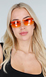 Deze zonnebril heeft een smal rechthoekig montuur met een goudkleurig metalen frame. De glazen zijn oranje gradient getint en lopen over in een lichtere tint onderaan. Het montuur is afgewerkt met transparante neuspads en slanke metalen pootjes. Aan de zijkant is een klein vlinderdetail verwerkt bij het glas.