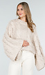 Deze handmade trui is uitgevoerd in een grof gebreide stof in een beige kleur. Het model heeft een ronde hals en een opvallend kabelpatroon aan de voor- en achterzijde. De lange mouwen zijn extra wijd en vallen losjes langs de armen. De trui heeft een rechte pasvorm met een afwerking in ribboord aan de onderzijde en manchetten. De lengte komt tot op de heup.